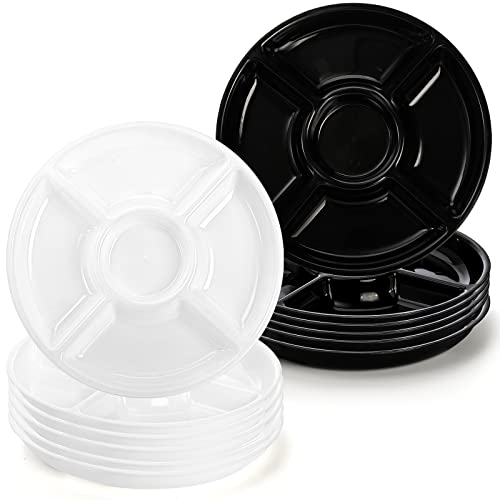 The Okllen 12 Pack 5 Sectional Round Plastic Serving Tray is a versatile and stylish addition to any gathering or party. This set includes 6 black chip and dip plates and 6 white ones, all made from break-resistant and durable hard plastic. The trays feature 5 divided sections with a center dip section, making them perfect for serving snacks, appetizers, and desserts. With their 12" diameter, they provide ample space for a variety of foods. Whether it's an office desk, kitchen, dining room, or a special event like weddings or birthday parties, these trays are suitable for any occasion. The round shape and classic black and white color add a touch of elegance to any decor. However, keep in mind that there are no matching or fitting lids available for these trays. Overall, the Okllen 12 Pack 5 Sectional Round Plastic Serving Tray offers quality, versatility, and style for all your serving needs.
