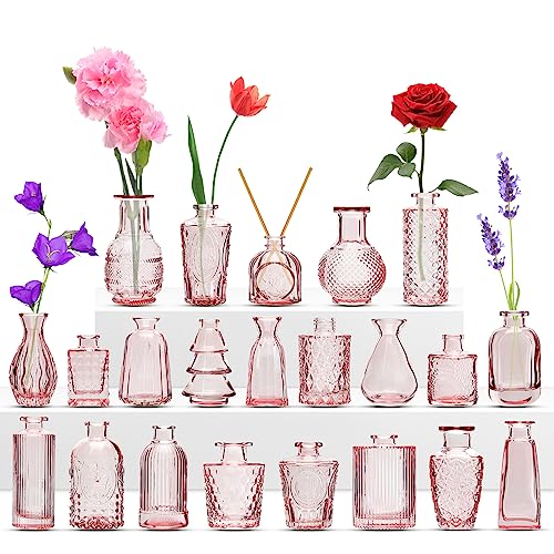 Enhance your home or special event decor with the 22 Pack Flower Vase – BEAHOT Mini Bud Vases in Bulk. These charming and elegant glass vases come in different shapes, featuring vintage patterns that add a touch of sophistication to any setting. Made of thick and sturdy glass, these vases are durable and showcase the beauty of flowers and cuttings. Ideal for home decoration, weddings, parties, and as gifts. The vases are carefully packaged to avoid breakage during transportation. Available in a lovely pink color that adds a soft and romantic ambiance. Transform your space into a beautiful haven with these exquisite mini vases.