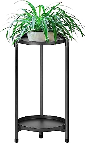 The NADONEL Plant Stand is a two-tier metal black stand designed for indoor and outdoor use. With a height of 24 inches, it is perfect for placement in the living room, bedroom, porch, or patio. The stand has excellent loading capacity of up to 60 lbs, making it sturdy and durable. Its simple design and elegant appearance make it a great companion for any indoor or outdoor plant. The three-legged design provides stability, easy assembly, and ample space for plants to grow. The screwless design allows for quick and easy assembly in just 1 minute. Available in black color.