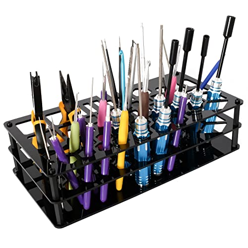 Keep your screwdrivers, wire cutters, pliers, and scissors organized with the Screwdriver Storage Rack. This acrylic tool storage rack is durable and resistant to stripping and breaking. With its 52 holes, it can accommodate various tools, making it the perfect choice for advanced RC model enthusiasts. The DIY unassemble package allows you to enjoy the process of assembling the storage shelf stand. The black color adds a sleek touch to your workspace. Say goodbye to the mess on your bench or in your drawers and easily find the tools you need with this practical and convenient organizer.