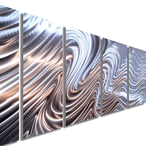 Enhance your contemporary decor with the Statements2000 Modern Metal Wall Art. This unique piece, titled Hypnotic Sands, is designed by artist Jon Allen and features a tranquil silver design that will complement any modern or abstract interior. Measuring 68" x 24", this large metal wall art creates a striking impact with its multi-panel design and 3D effect. It comes with pre-installed brackets that float the artwork 2 inches off the wall, giving it a visually appealing appearance. Handmade in the USA, it is signed by the artist and includes a certificate of authenticity. Whether displayed indoors or outdoors, this silver metal wall decor is sure to impress under natural or track lighting.