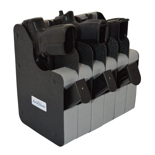The BenchMaster Weapon Rack is a multi-gun vertical pistol rack designed for safe and secure gun storage. It can accommodate up to 6 pistols of any caliber with or without magazines. Made with KYDEX and high-density foam, this pistol organizer provides soft but rigid protection, ensuring that your guns won't be marred. The rack is lightweight, has high resiliency, great shock absorption, and won't collapse with heavy weight. It contains no metal parts and has excellent chemical resistance. Handmade in the USA with All-American caliber materials, this rack is a reliable storage solution. Overall, it is an efficient and space-saving option for organizing and storing your pistols.
