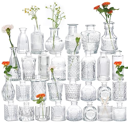 The BIGIVACA Set of 30 Glass Clear Bud Vases in Bulk is an excellent choice for adding elegance to any event or home decor. Made of strong and durable glass, these vases come in various unique designs and shapes. They can hold small floral arrangements and add flair to wedding centerpieces, bridal showers, and more. The vases also make a great gift option for special occasions. With secure packaging, they arrive safely and ready to use. While there may be occasional breakage and some customers find the size smaller than expected, overall, these bud vases offer quality and value. Enhance your space with these beautiful and versatile glass vases.