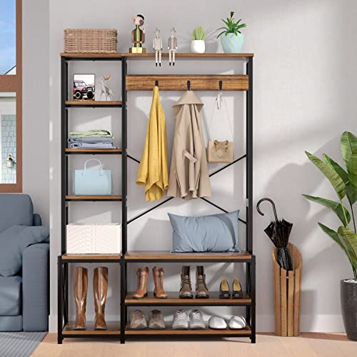 The HOOBRO Hall Tree is a unique and multifunctional storage solution for your entryway or closet. With its rustic brown and black design, it adds an industrial touch to any space. This hall tree features a bench, 5-tier shoe storage organizer, and 9 hooks for coats and accessories. The shelves are made of mesh and can support up to 44 lb each, while the hooks can hold up to 11 lb. The coat tree is made of high-quality particleboard and a sturdy metal frame, ensuring stability and durability. It is easy to assemble with the included instructions and numbered parts. Keep your home clean and organized with the HOOBRO Hall Tree.