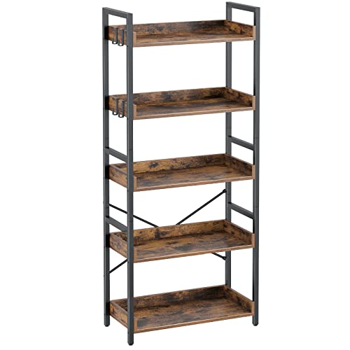 The Yoobure 5 Tier Bookshelf is a tall, modern bookcase with a sleek silhouette and vintage finish. It is designed to fit seamlessly into any decor and provides generous storage space for your office, living room, study, or balcony. This versatile bookshelf can also be used as a display shelf, kitchen shelf, bathroom storage shelf, or plant shelf. The bookshelf features a sturdy metal frame paired with premium wood boards, allowing it to hold up to 50lbs on each shelf. It is easy to assemble with the included tools and instructions. With its stylish design and reliable sturdiness, the Yoobure 5 Tier Bookshelf is a great addition to any space.