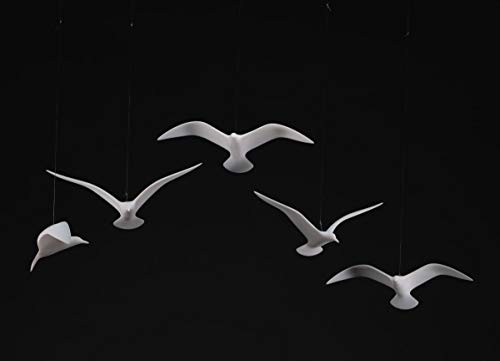 The 5 Seagull Mobile by John Perry is a stunning and unique do-it-yourself decorative piece. With a wingspan of 9 inches each and a total width of 30 inches, this mobile is a beautiful addition to any space. The seagulls are designed to be assembled with fishing line, giving it an elegant and airy look. While assembly is required, some users have found it challenging, especially those with vision problems. However, once assembled and hung, this mobile creates a peaceful and calming ambiance. It can be a great gift option, provided that the recipient is able to install it or has someone to assist them. Overall, the 5 Seagull Mobile by John Perry is a beautiful piece of art that adds a touch of elegance to any environment.