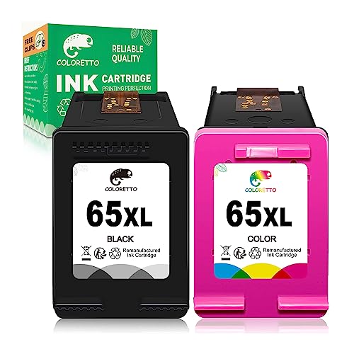 The COLORETTO 65XL Remanufactured Printer Ink Cartridge Replacement is a high-quality, affordable alternative to OEM ink cartridges. This combo pack includes 1 black cartridge and 1 tri-color cartridge. With a one-year warranty and the option for replacements or free charges for defective cartridges, you can have peace of mind while shopping. The cartridges are compatible with a range of HP Deskjet, ENVY, and AMP series printers, and they offer high-quality chip and ink for monitoring ink levels. With a tested page yield and comparable print quality to genuine cartridges, you can save money without compromising on performance. Say goodbye to expensive ink and hello to affordable printing with COLORETTO.